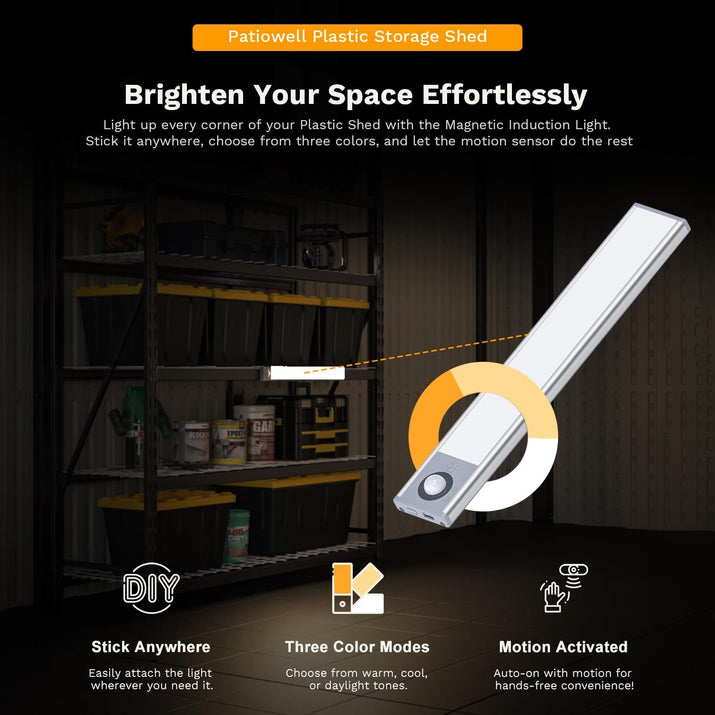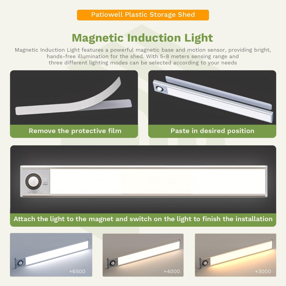 The magnetic induction light features a powerful magnetic base and a motion sensor, providing bright, hands-free illumination. With a 5-8 meters sensing range and three adjustable lighting modes, it’s designed for convenience while enhancing visibility inside the shed.