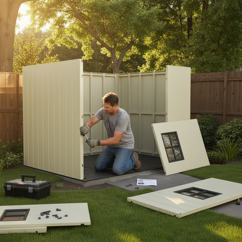 Our shed is constructed from high-quality, recyclable materials that ensure durability and lightweight handling. Its beige walls and gray roof not only make it stylish but also enhance its long-lasting performance against various weather conditions.
